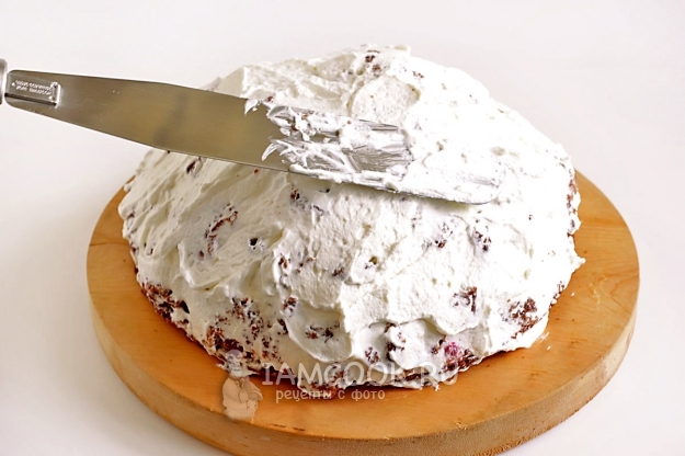 Обмазать весь торт сливками и полить растопленным шоколадом по желанию. Дать торту настояться в холодильнике пару часов.