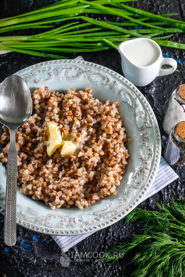Выложите готовую гречневую кашу в тарелки, сдобрите кусочком качественного сливочного масла. Подайте к столу теплой. Можно дополнить блюдо колбасными или мясными изделиями, овощным салатом.