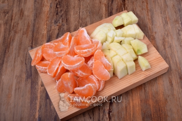 Пока вода закипает, яблоко очистим и нарежем на произвольные кусочки, мандарины очистим, удалим белые волокна и разберем на дольки.