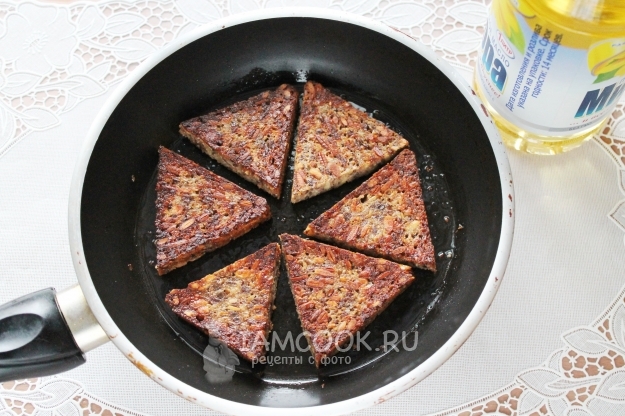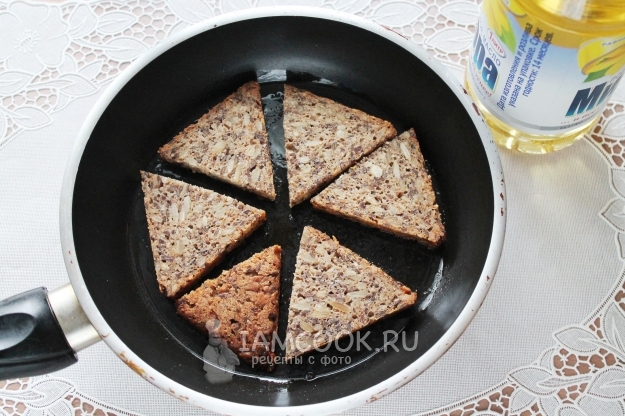 Сначала нарежьте фигурно хлеб и поджарьте его с одной стороны на разогретой сковороде с маслом.