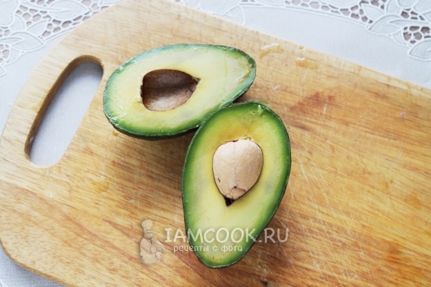 Авокадо разрежьте пополам, удалите косточку, очистите кожуру.