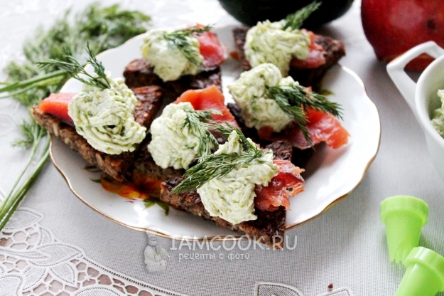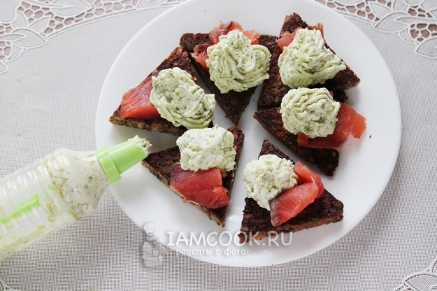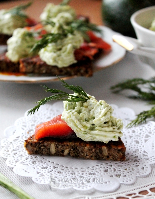 На поджаренный хлеб положите ломтик рыбы, а сверху разместите полученную пасту из авокадо и сыра.