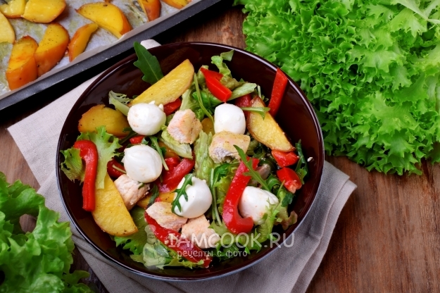 В большом блюде смешаем салатную зелень, картофельные дольки, кубики куриного филе, печеный перец и моцареллу. Добавим заправку, перемешаем салат и сразу подадим к столу.