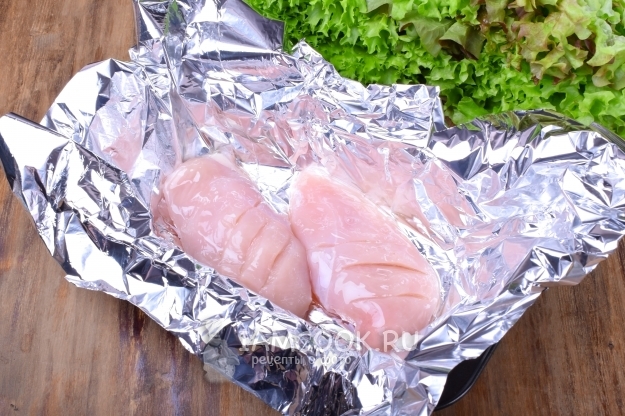 Небольшую форму выстелем фольгой и выложим куриное филе. Плотно закроем мясо фольгой и отправим в духовку к картофелю запекаться на 20-25 минут. Приправлять мясо пока не нужно. Чтобы грудка равномерно запеклась, на более толстой стороне филе я сделала несколько надрезов.