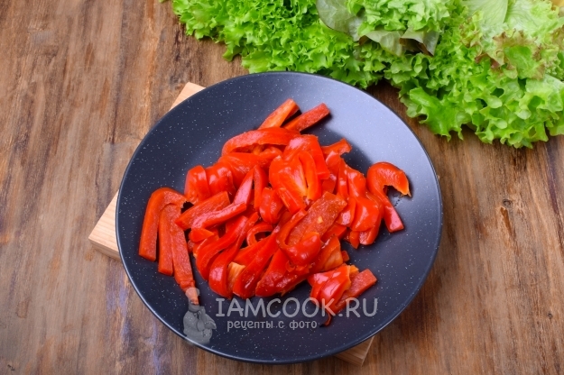 К этому времени печеный перец остыл и пропарился под крышкой, это позволит легко снять обугленную кожицу. Удобно снимать кожицу, прихватывая ее бумажным полотенцем. Очищенную мякоть перца нарежем тонкими полосками.