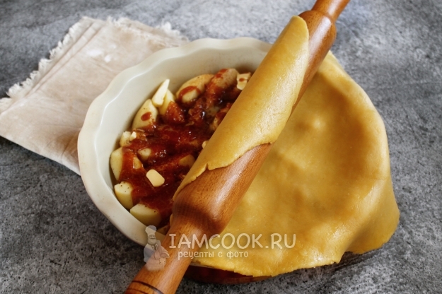 Так, прогревая и добавляя ложку за ложкой сахара, получаем карамель. Тесто раскатываем пластом толщиной около 2-3 мм, диаметром 24-26 см, с небольшим припуском.