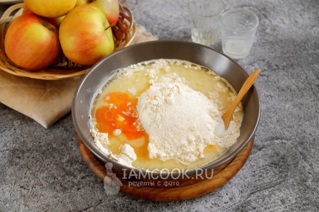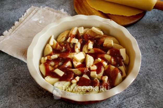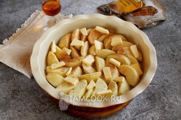 Очищенные яблоки нарезаем толстыми дольками, плотными рядами укладываем в промасленную форму. Посыпаем молотыми корицей и мускатным орехом, заливаем ромом (по желанию), равномерно разбрасываем кусочки сливочного масла.