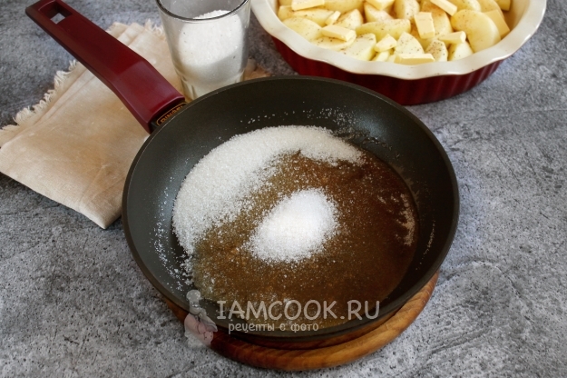 Отдельно топим сахарный песок — по ложке высыпаем на раскаленную сковороду, иногда встряхиваем и распускаем до жидкого состояния, затем добавляем следующую ложку сахара.