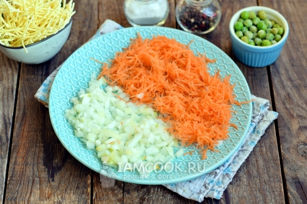 Лук и морковь отделите от верхнего слоя, вымойте, морковь измельчите на терке, лук нарежьте ножом в форме небольших квадратиков.