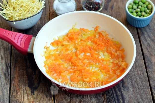 Овощи совместно пассеруйте на масляной сковороде до прозрачности лука и мягкости моркови. Для этого сначала в сковороду закиньте лук, через 2 минуты добавьте морковь. Чтобы овощи не пригорели, огонь держите на среднем уровне, смесь периодически перемешивайте. Сразу после обжарки овощи отправьте в кастрюлю - вслед за картофелем, продолжайте варить.
