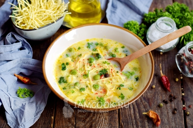 После снятия с плиты дайте супу немного постоять, чтобы лапша дошла до готовности. Готовый сырный суп с яичной лапшой и зеленым горошком разлейте по тарелкам, кидая в каждую порцию измельченную зелень.
