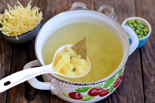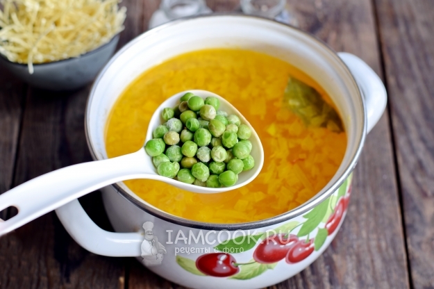 Через 10 минут после закладки картофеля, добавьте в суп мороженый зеленый горошек, предварительно не размораживая его.