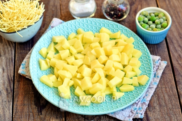 С картофеля снимите кожицу, вымойте, настрогайте корнеплод небольшими кусочками.