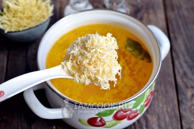 Мягкий плавленый сырок натрите на терке с маленькими отверстиями, также добавьте в суп. Непрерывно перемешивайте суп на протяжении 1 минуты, максимально быстро растворяя сыр в жидкой основе. В этот момент добавьте недостающую жидкость, увеличивая огонь до максимального.