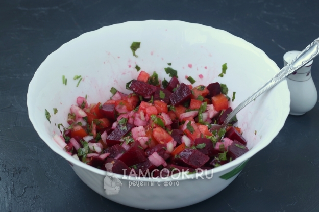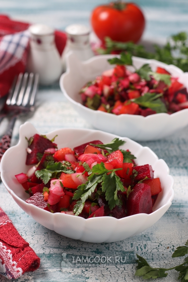Хочу предложить вам очень простой салат, в котором сочетаются свекла и помидоры. Этих овощей в салате должно быть приблизительно поровну, чтобы вкус был гармоничным. Марокканский свекольный салат очень хорошо подавать к шашлыкам, а в пост он разнообразит ваше меню. Вегетарианцам салат можно предложить в качестве завтрака или ужина.