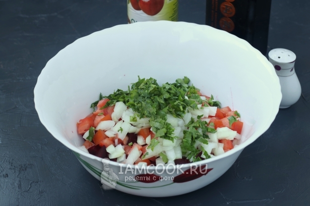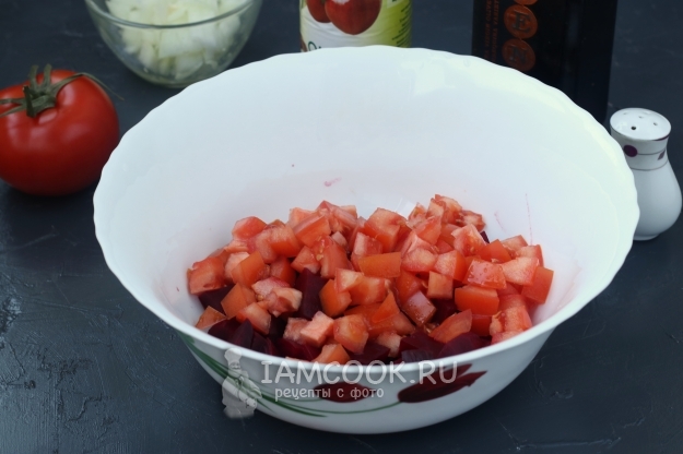 Мелкими кубиками нарезать помидор и добавить его к свекле.