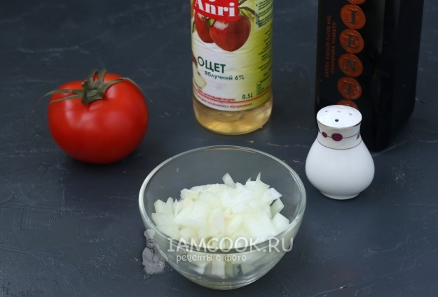 Мелко нарезать репчатый лук, сложить его в небольшую пиалу, посолить, добавить яблочный уксус. Также можно использовать лимонный сок.