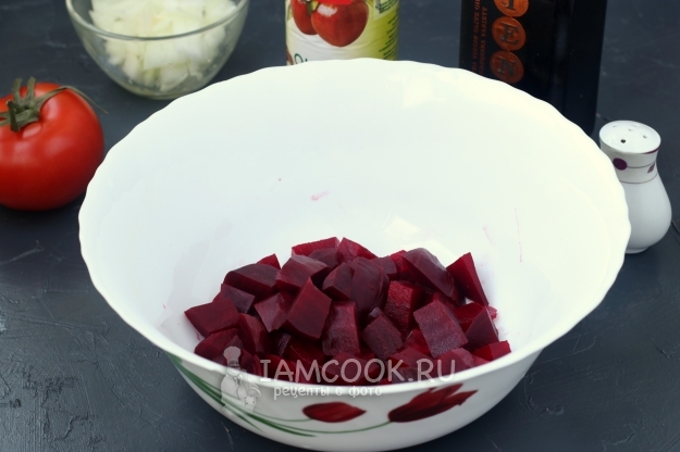 Варёную свеклу остудить, почистить и нарезать крупными кубиками. Сложить в миску.