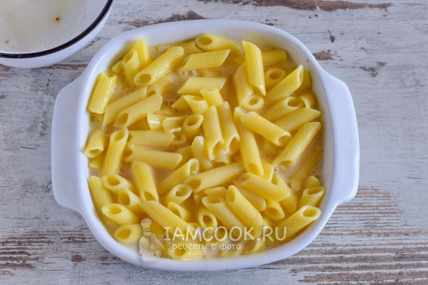 Затем заливаем макароны приготовленной ранее заливкой. Заливка должна полностью покрывать макароны.