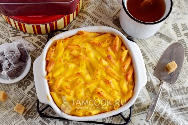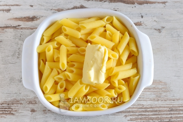 С готовых макарон сольем жидкость, отбросив их на дуршлаг. Затем перекладываем макароны в форму для запекания. Добавляем сливочное масло и хорошо перемешиваем макароны, чтобы масло растаяло.
