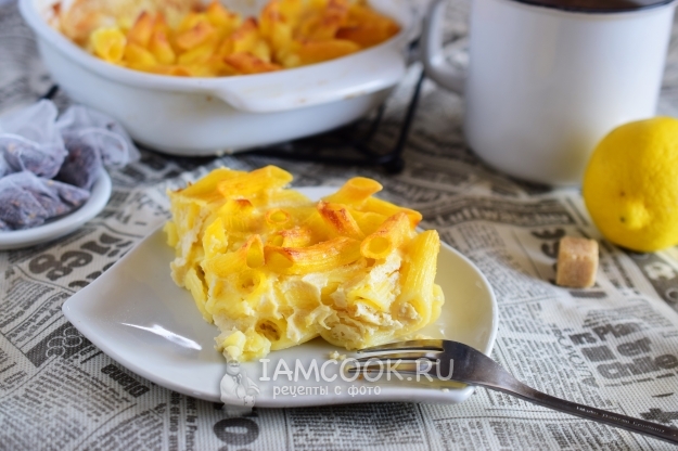 Достаём готовую сладкую запеканку из макарон из духовки и даем ей немного постоять, минут 10. Запеканка немного остынет и станет более плотной, после чего ее будет легко нарезать на порционные кусочки.