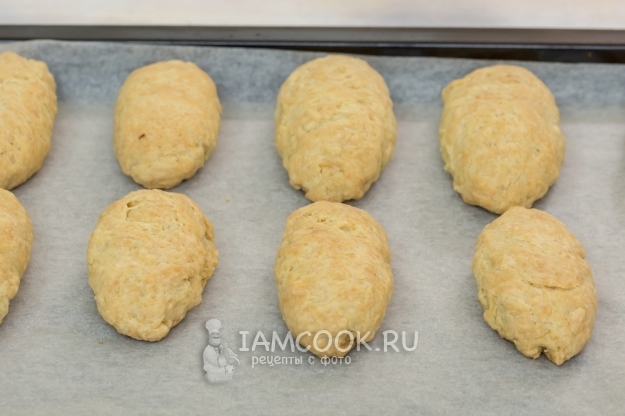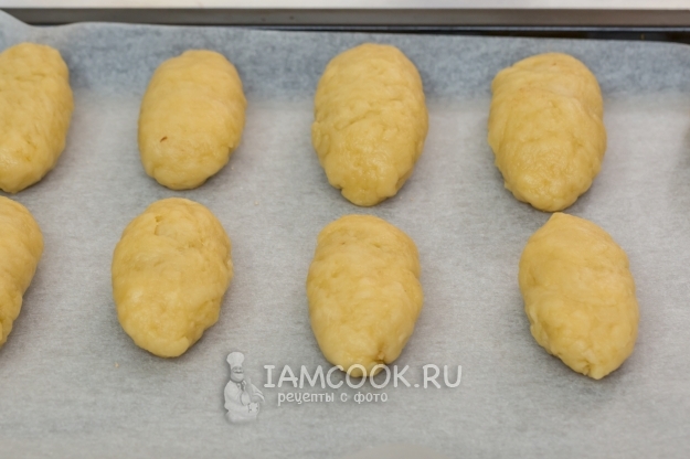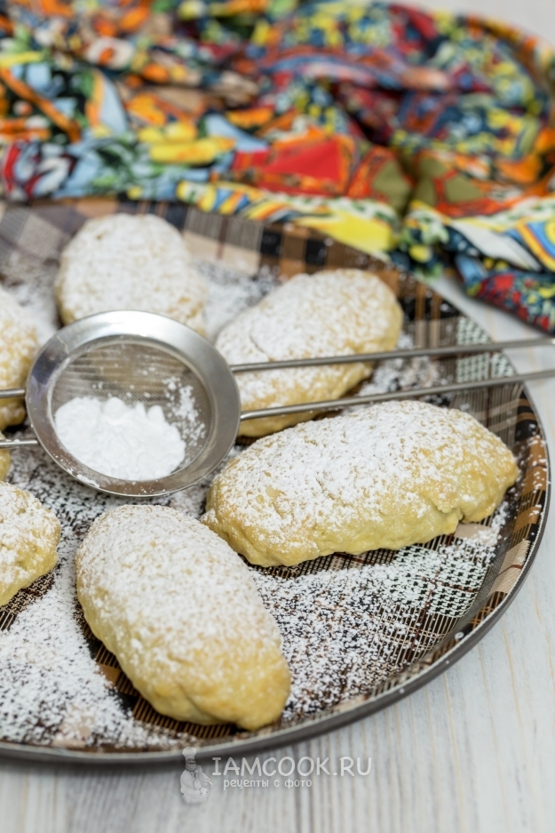 Тесто разделить на кусочки. Каждому кусочку придать форму овала, выложить начинку и сформировать вытянутое печенье, тщательно защипывая шов.