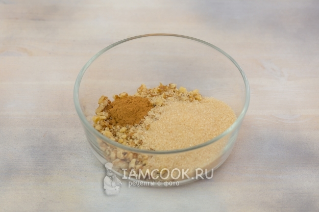 Для начинки измельчите орехи так, чтобы были достаточно крупные кусочки. Удобно это делать, вооружившись молоточком для мяса. Поместите орехи в пакет и пробейте их молоточком. Можно нарезать ножом.