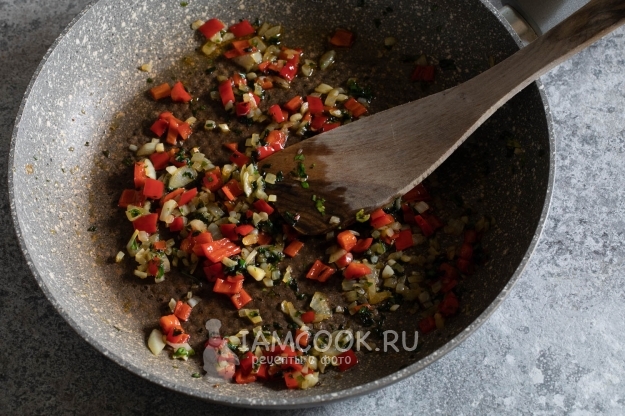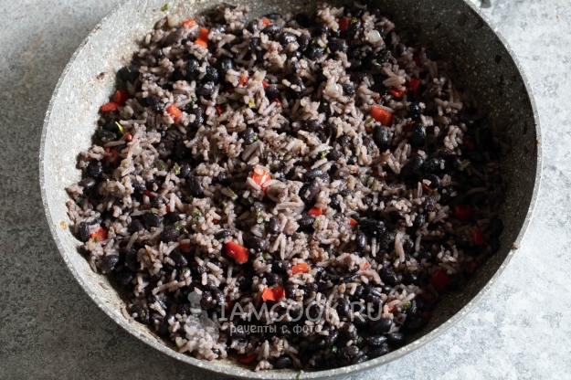 Добавляем рис и варёную чёрную фасоль (обязательно с водой, в которой она варилась), солим, перчим, добавляем чуть-чуть кари, и жарим около пяти минут, пока жидкость от фасоли не выпарится полностью.