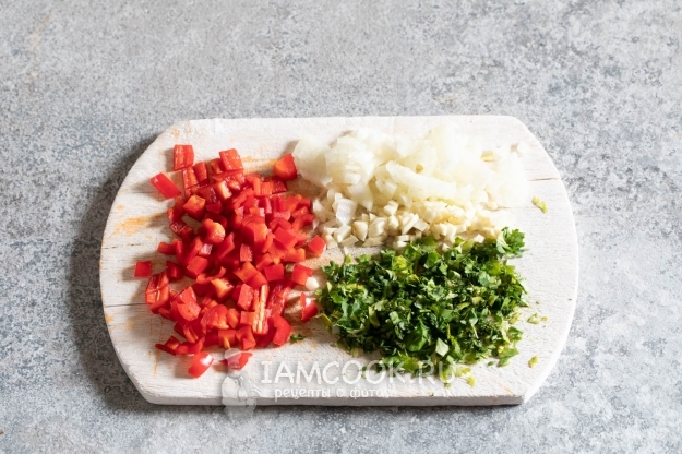 Поближе к концу приготовления риса мелко режем лук, чеснок, красный перец и кинзу. В смысле, в Коста-Рике у них там совсем другое растение, но из наших к нему ближе всего по вкусу именно кинза.