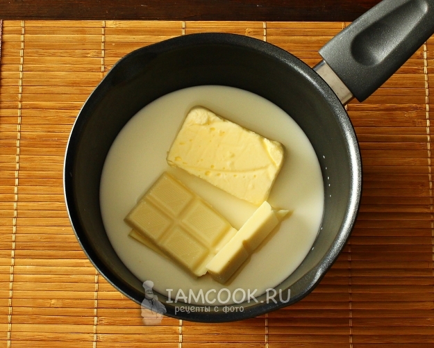 В небольшой ковш или кастрюлю вливаем молоко, добавляем сливочное масло и шоколад. На небольшом огне, помешивая, подогреваем содержимое, чтобы масло и шоколад растопились. Остужаем до теплого состояния.