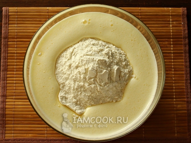 Теперь всыпаем муку, смешанную с разрыхлителем. Перемешиваем.