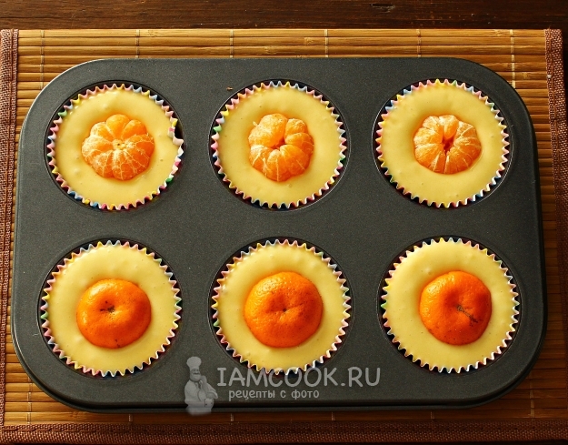 В формочки вкладываем бумажные капсулы, вливаем тесто, заполняя на 2/3 объема (можно использовать силиконовые формочки). Мандарины очищаем. В центр каждой формочки выкладываем по целому мандарину, немного притапливая его. Можно положить мандарины, не очищая от кожуры, но это на любителя. Часть кексов я готовила с очищенными, часть - в кожуре. Нам больше всего понравились кексы с очищенными мандаринами.