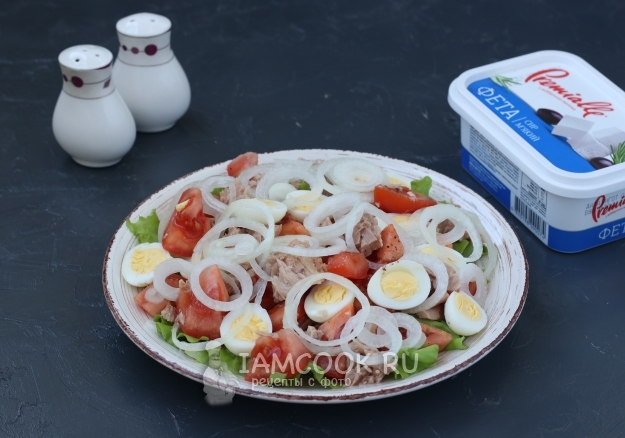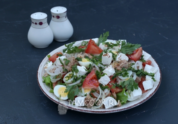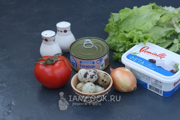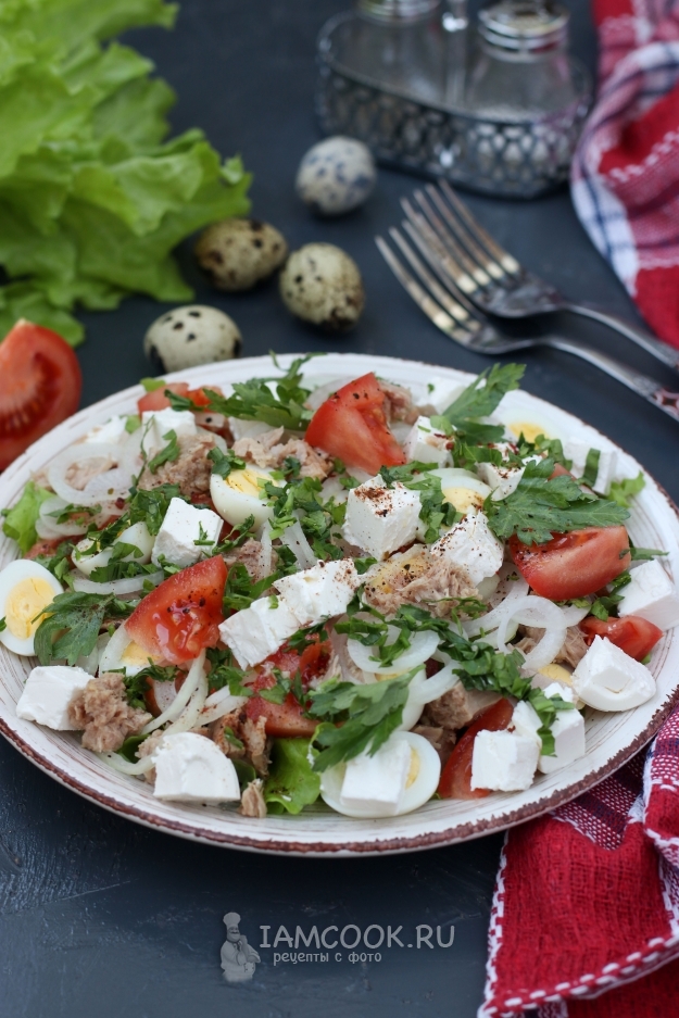 Вкусный и полезный салат с тунцом, фетой и перепелиными яйцами готов, можно подавать к столу.