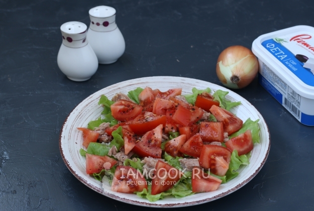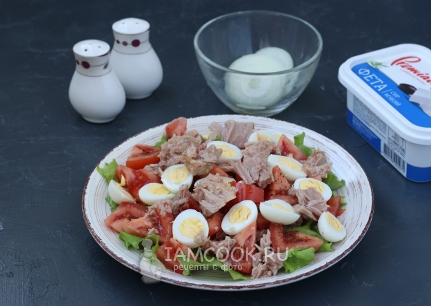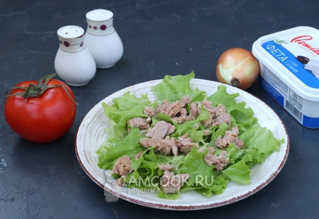 Сверху на листья выложить половину тунца.