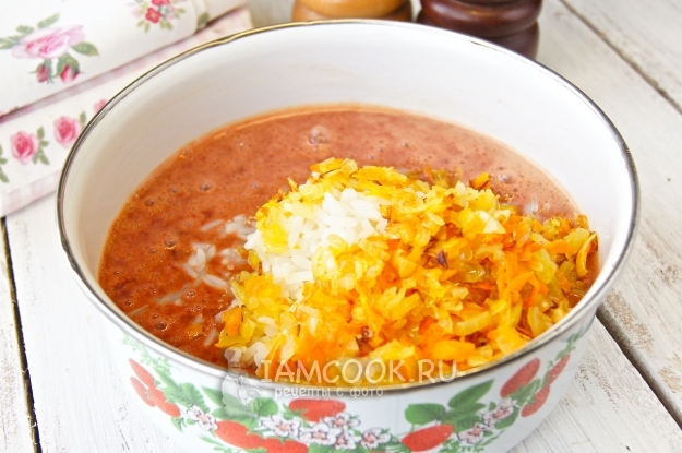 Добавим зажарку и перемешаем, на этом этапе взбивать не нужно.