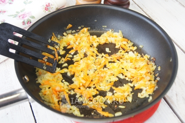 Разогреем сковороду с растительным маслом, выложим овощи и обжарим до мягкости, немного остудим.