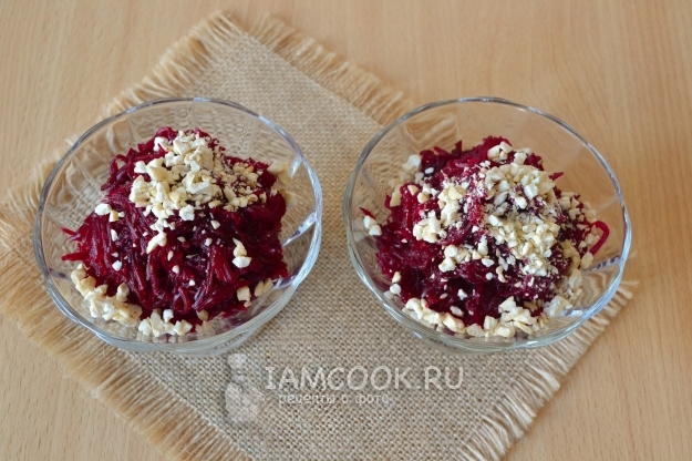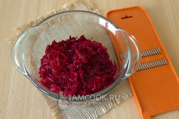 Выкладываем тертую свеклу в порционные салатники или оставляем в замесочном.