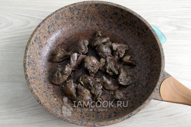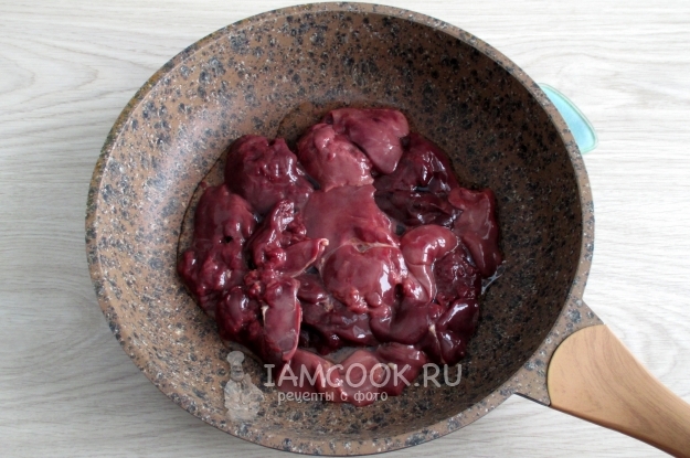 Куриную печень очистите от жилок и жира.