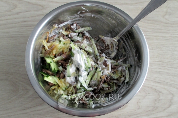 Перед подачей заправьте салат майонезом.