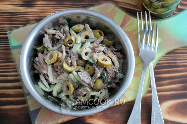 Такой салат с куриной печенью, оливками и огурцом вкусен и в теплом, и в холодном виде.
