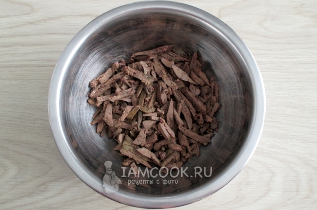 Готовую печень нарежьте соломкой. Понятно, что куриная печень неправильной формы, так сказать, но всё-таки ориентируйтесь на нарезку брусочками.