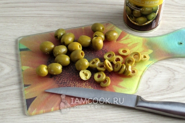 Консервированные оливки нарежьте колечками.