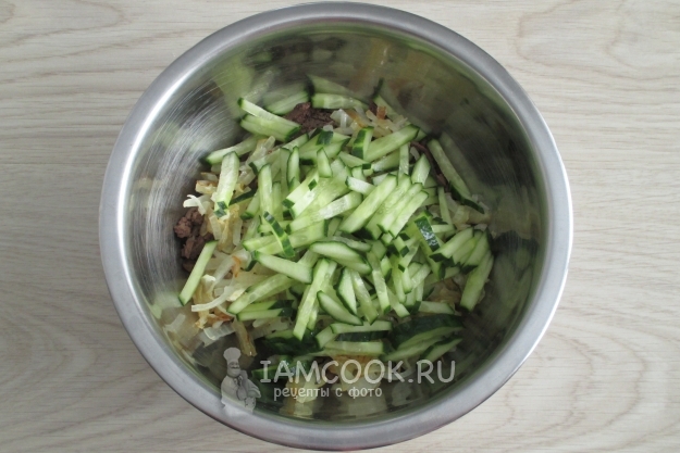 Огурец нарежьте соломкой и соедините с другими ингредиентами.