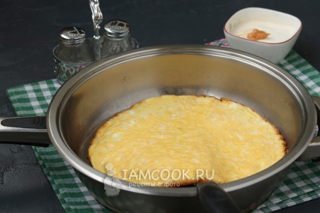 Разогреть в сковороде ложку масла, вылить яично-сырную массу и пожарить омлет. Дать ему остыть.