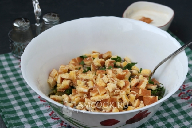 Добавить полученную заправку в салат. Хорошо перемешать.