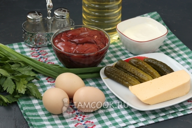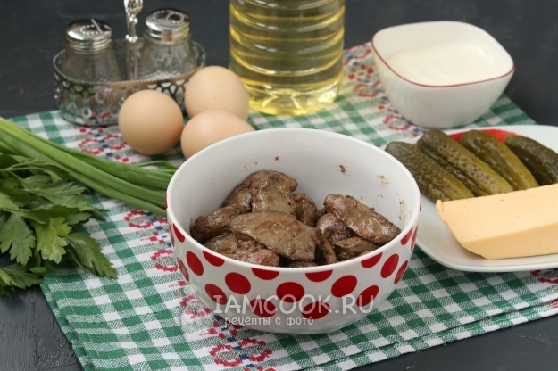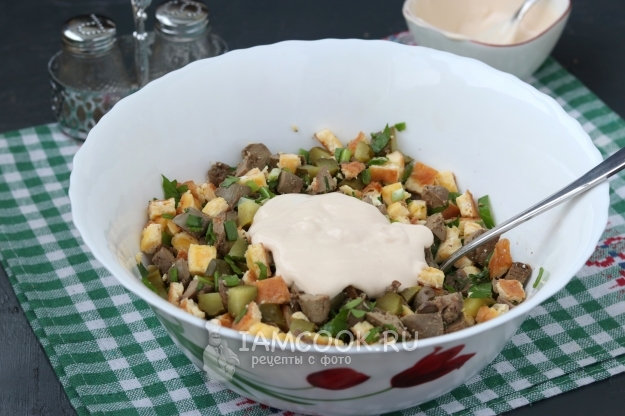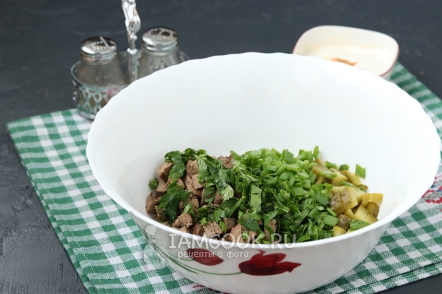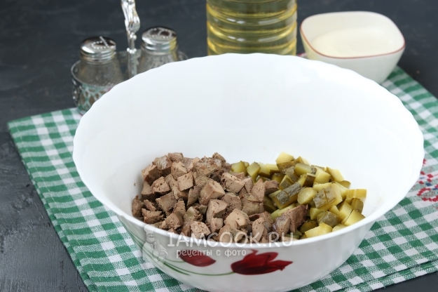 Кубиками нарезать маринованные огурцы и печень, сложить в глубокую миску.