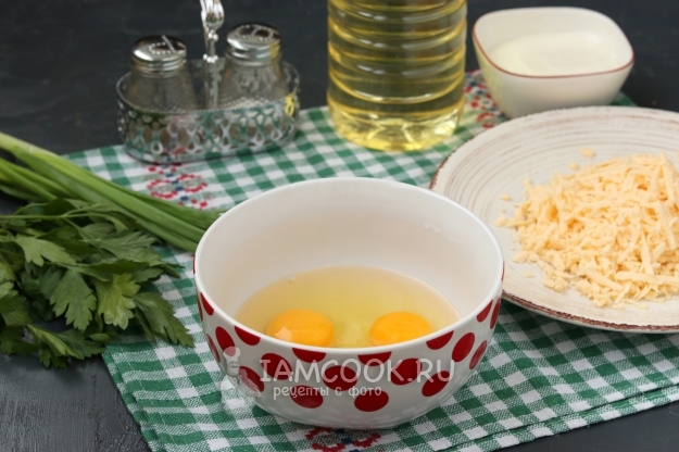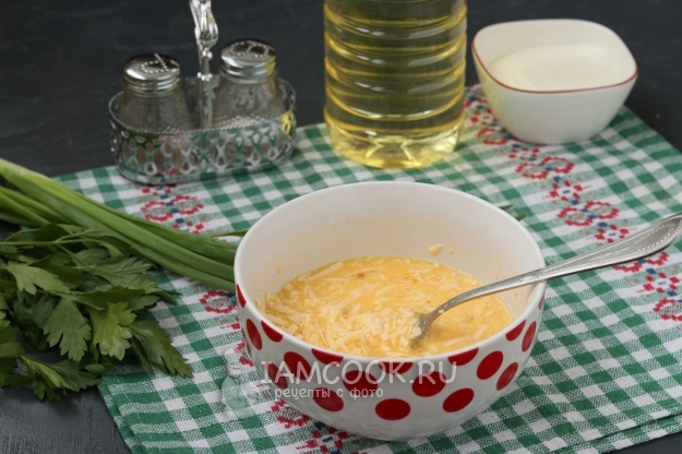 Далее нужно приготовить сырный омлет. Для этого разбить в миску яйца, разболтать их вилкой, немного посолить. Натереть на тёрке твёрдый сыр.