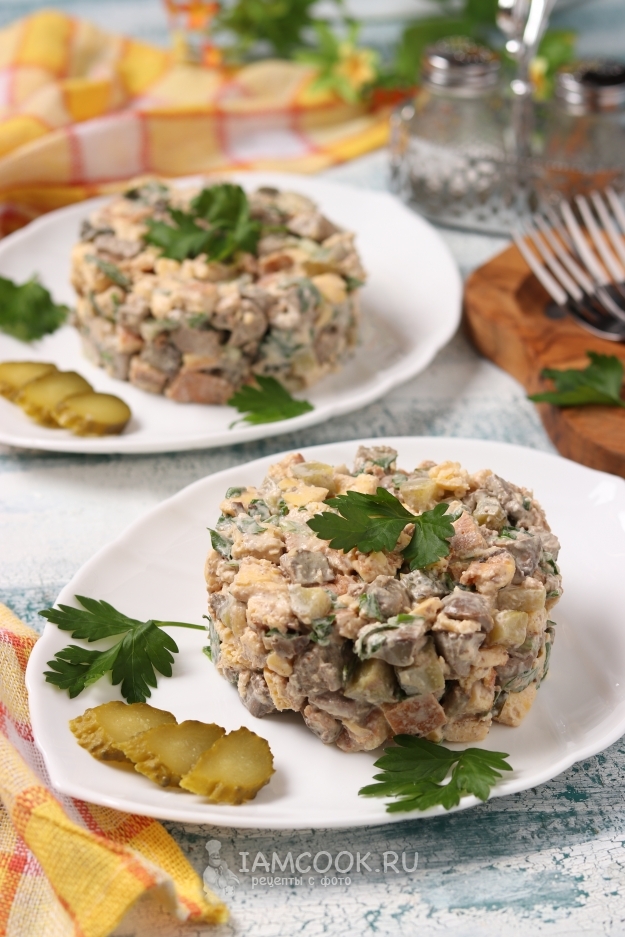 Вкусный и сытный салат «Мельник» подать к столу, разложив на порции.