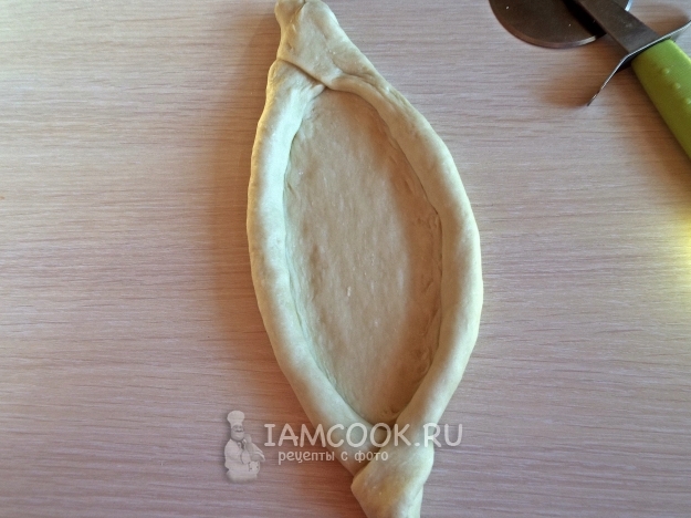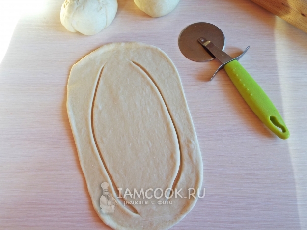Тесто разделить на пять частей. Раскатать каждую часть в широкий овал. Сделать с двух сторон надрезы, но не до конца.