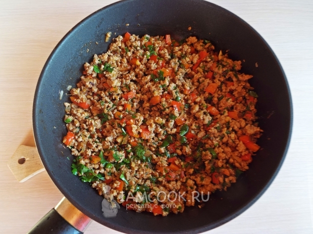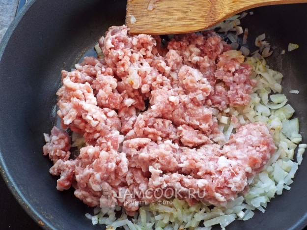 Обжарить немного на масле и добавить фарш.